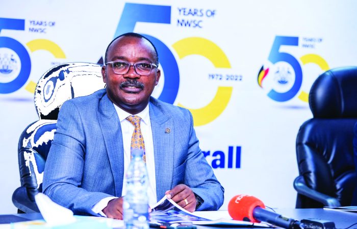 NWSC Managing Director Dr. Eng Silver Mugisha and NWSC Board Chairman Dr. Eng. Prof Badru. M. Kiggundu respectively speaking to the press (PHOTO/Courtesy).
